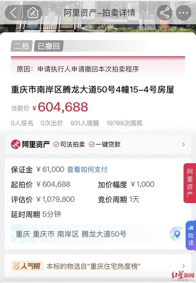 叶某作为现房主,因为一直未偿还银行的借款和利息等费用,成为被执行人,重庆市渝北区人民法院裁定,依法拍卖登记在叶某名下的这套房屋。根据法拍公布的相关信息显示,此房屋评估价:107.98万元,起拍价:60.4688万元,原计划在2025年8月7日10点起拍。7月25日,因“申请执行人申请撤回本次拍卖程序”,房屋的二次拍卖被撤回。